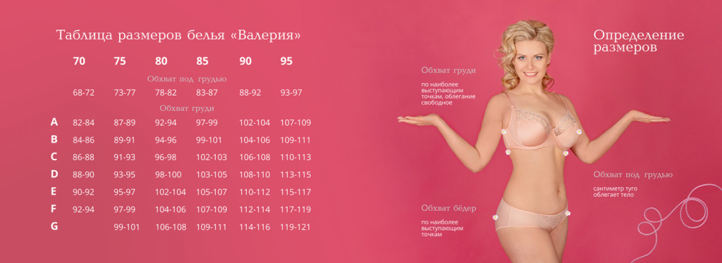 1) Чтобы определить, какой у Вас размер бюстгальтера (первая строчка таблицы), необходимо измерить обхват под грудью в см (вторая строчка таблицы)